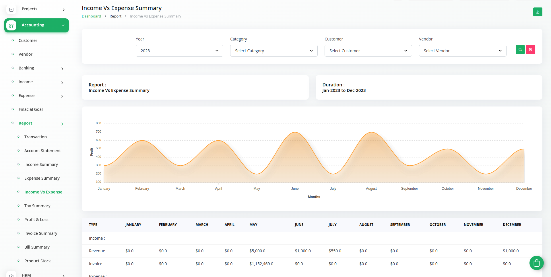 A budget is a financial plan for a specified period to keep in check with the working capital. This feature here helps to maintain the capital flow. You can set monthly, quarterly, half-yearly, or yearly budgets according to your business plans and needs. The main categories are “Income” and “Expense” where one can edit /update /delete the sub-categories as well.