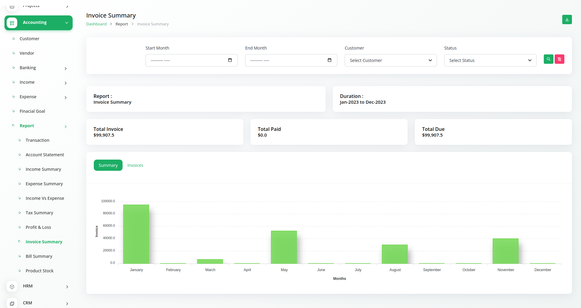 Get a report on transactions with an easy filtering option. Download the required account statements in either PDF, CSV, or Excel format. You get duly prepared reports on individual Income, Expenses, Tax, Invoice, and bill summary. Filter them based on Account, category, and customers. Also, a graphical display of the Income VS Expense chart along with a detailed calculation of Profit and Loss will help you make informed decisions. Filter the tax summary and Income VS Expense chart based on financial years.